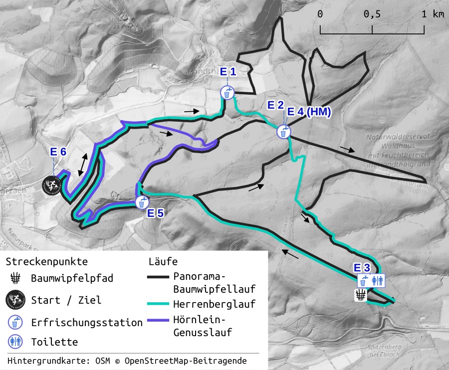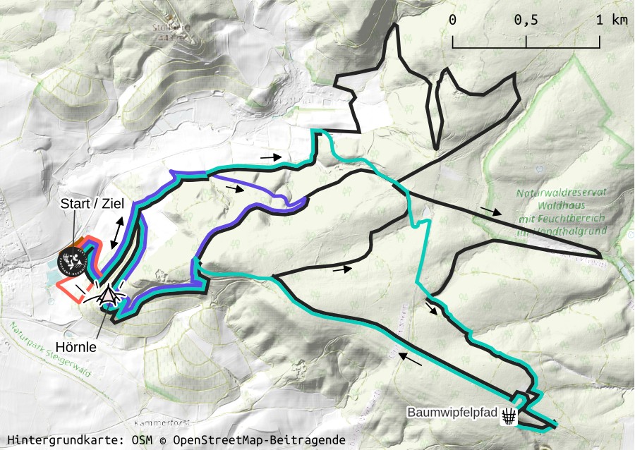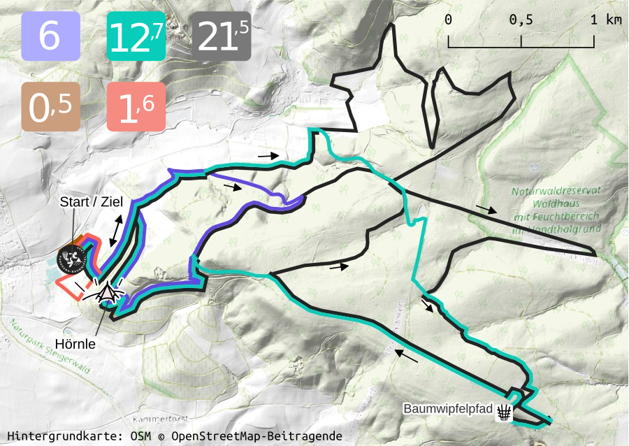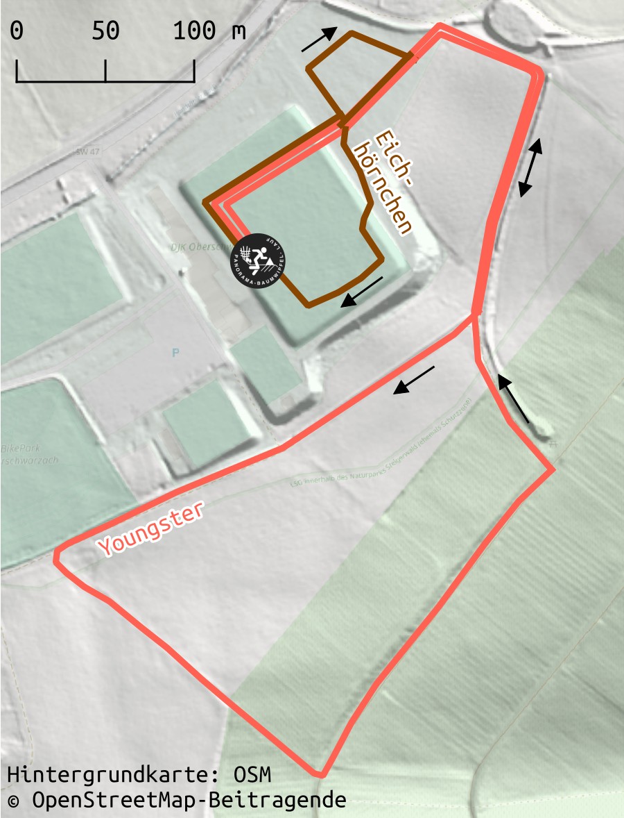 Start und Ziel befindet sich jeweils am Sportplatz in Oberschwarzach (→Link zur Anfahrtsplanung).  Die Strecken durch die Oberschwarzacher / Handthaler Weinberge und das Ebracher Forst bieten eine abwechslungsreiche Mischung aus ebenen Abschnitten, knackigen Anstiegen und erholsamen Bergab-Passagen mit kleinen und großen Panorama-Highlights auf dem Baumwipfelpfad und Herrenberg an der 14-Nothelfer-Kapelle („Hörnle“).